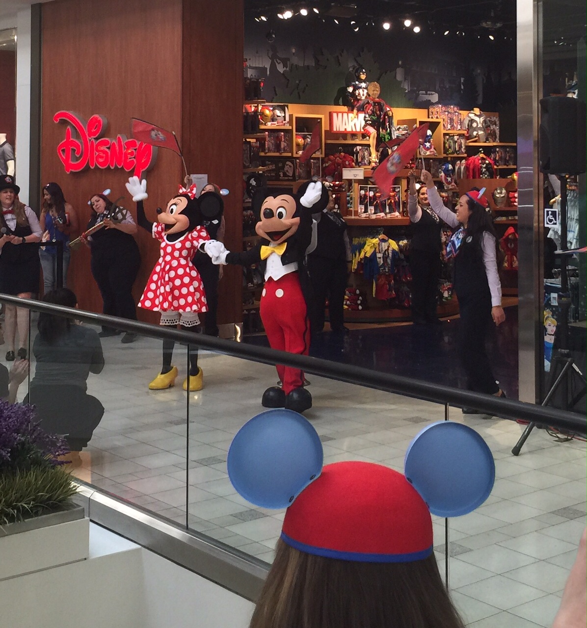 The funny-looking hats were Mickey Mouse Ears as found at the Disney Parks. We do not question the ears while walking through Disneyland, but here in a suburban mall, they stand out. The new Disney Store was officially opening today with a special ceremony set for 10am with special Mickey Mouse ears as a give away.