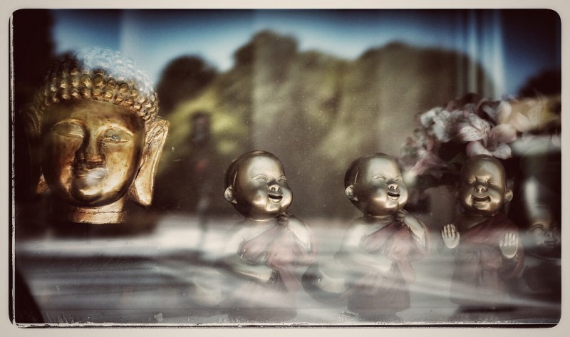 As I continue to explore my writing, I rediscovered my passion for photography with a commitment to carry my camera with me daily. While walking to lunch recently I saw these little Buddha statues in the window of a bridal dress shop. With camera at the ready I took the above shot focused on the available reflecting light.